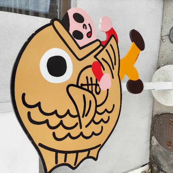 たい焼きに飲み込まれかけている飛び出し坊や。飛び出すのも無理ないよな、鯛に食いつかれてたら。